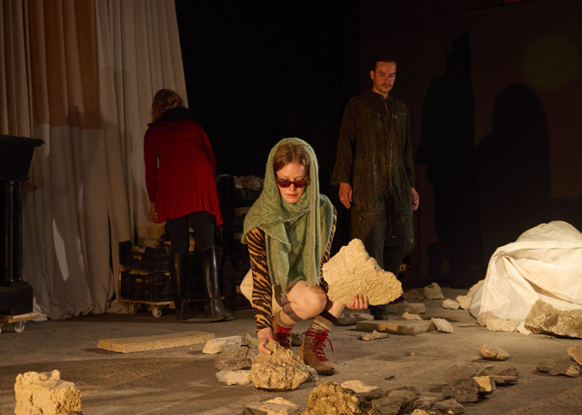 Nachhaltigkeit spielt nicht nur beim Inhalt sondern auch bei der Entwicklung und Herstellung von Bühnenbild und Kostümen eine Rolle. So werden Gegenstände der Bewohner*innen des Dorfs Schwabenhausen, wo das Stück aufgeführt wird, und Naturmaterialien aus der nahen Umgebung in die Ausstattung integriert.